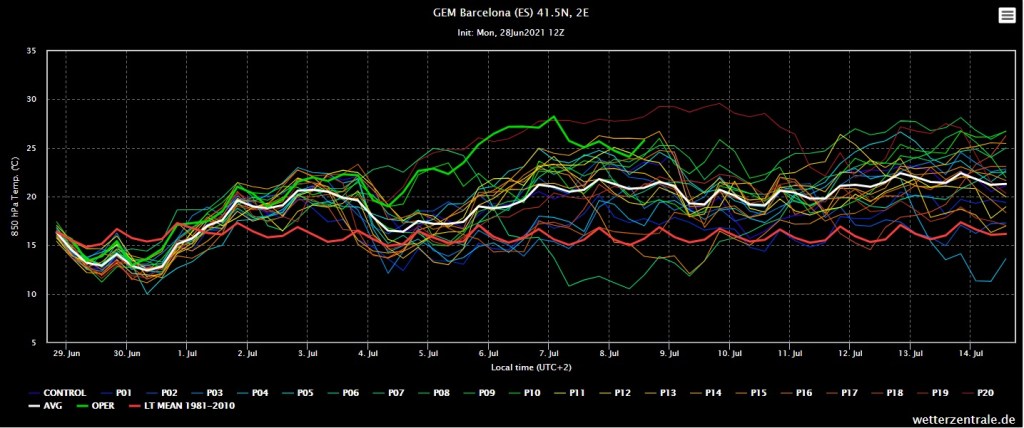 Mirando esta previsión de tiempo, sólo nos cabe pregurntarnos por qué no tenemos un verano normal!!!!. Para los que no lo sepáis interpretar, os lo explico. Es el mapa a 1500m de altura de Barcelona hasta el 14 de julio. La línea roja gorda, indica la media de los últimos años, y la blanca el promedio de los modelos. Las otras líneas nos indican exactamtente qué dice cada modelo.